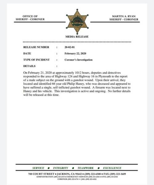 Haney’s body was found Friday morning by his car on a highway in Plymouth, California with a single gunshot. A firearm was reported found next to Haney.