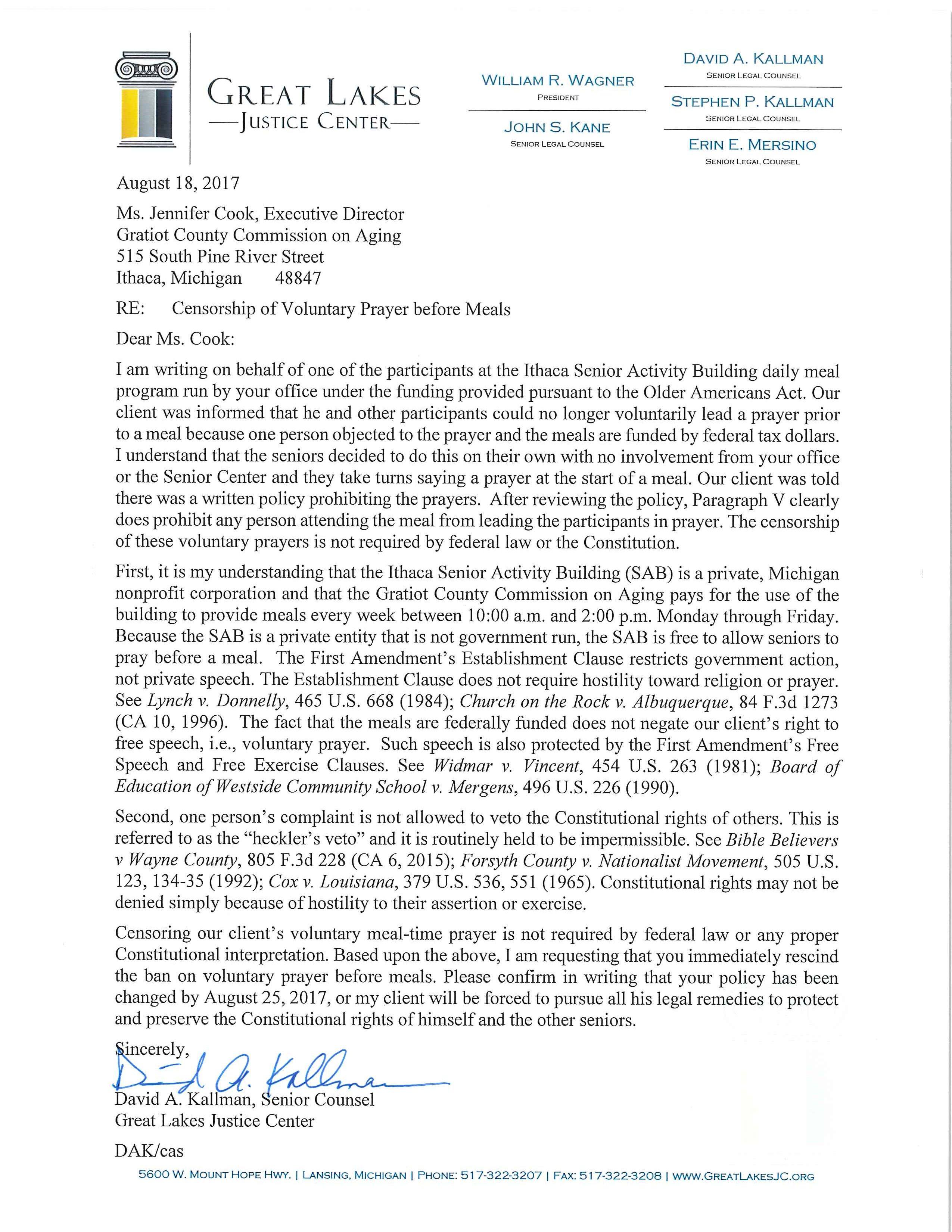 A Michigan legal group, The Great Lakes Justice Center, is reviewing the facts of the matter and is working to gather more information. David Kallman, Sr. Counsel with the GLJC remarked on the Steve Gruber Show that this is a flagrant use of the Establishment Clause. “I have left numerous messages with those at the senior center as well as those at state and federal agencies that are involved with supplying food to the elderly throughout Michigan,” Kallman said. However, the legal aid organization said it looks like a clear violation of the civil rights of the senior citizens that are participating in the meals. Kallman added “It appears they are conducting prayers before eating on a voluntary basis. This is not something that is being mandated by the senior center, this is something the people are doing because they want to.” “This does not violate federal law or the establishment clause by any stretch of the imagination,” Kallman continued, “and we will try to get them to back off this demand but if they don’t we will step in and pursue legal action against the center.