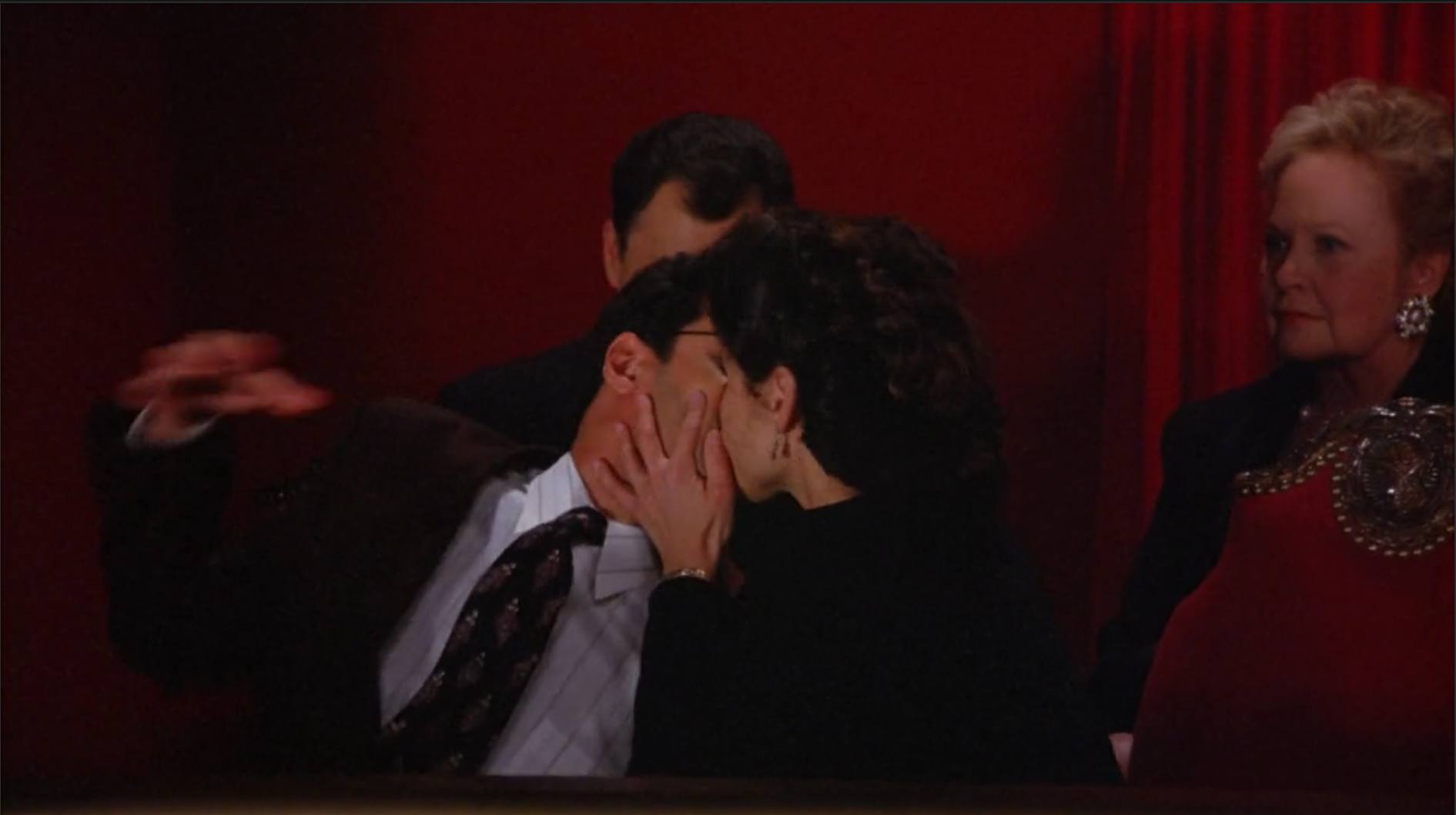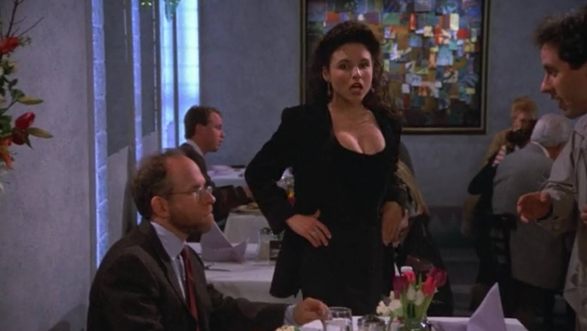George is caught gawking at the breasts of his boss’s 15-year-old daughter — which Jerry rips him about. “Looking at cleavage is like looking at the sun: You don’t stare at it. It’s too risky. You get a sense of it and then you look away!” To get George off the hook, the gang works up a scenario for Elaine to show off her cleavage in front of the boss to prove a point — that all straight men are helpless in this instance.