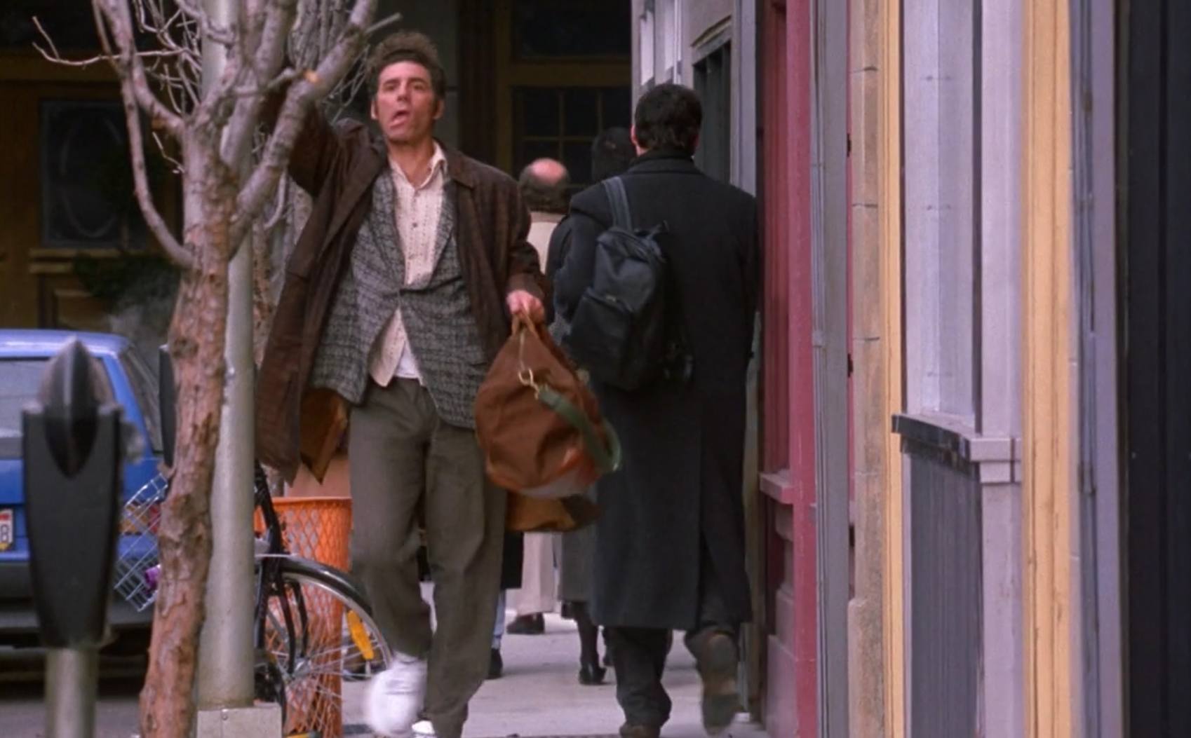 After the guys of “Seinfeld” finish up a basketball game with a man named Jimmy — who always refers to himself in the third person — they become intrigued with his special training shoes. Due to the new shoes, Kramer is mistaken for a mentally challenged person — and the novocaine from a dental visit that won’t wear off doesn’t help, either. Kramer drools all over the floor and speaks awkwardly (still wearing the silly looking shoes) — which is why he’s mistaken for an “able, mentally challenged adult.”