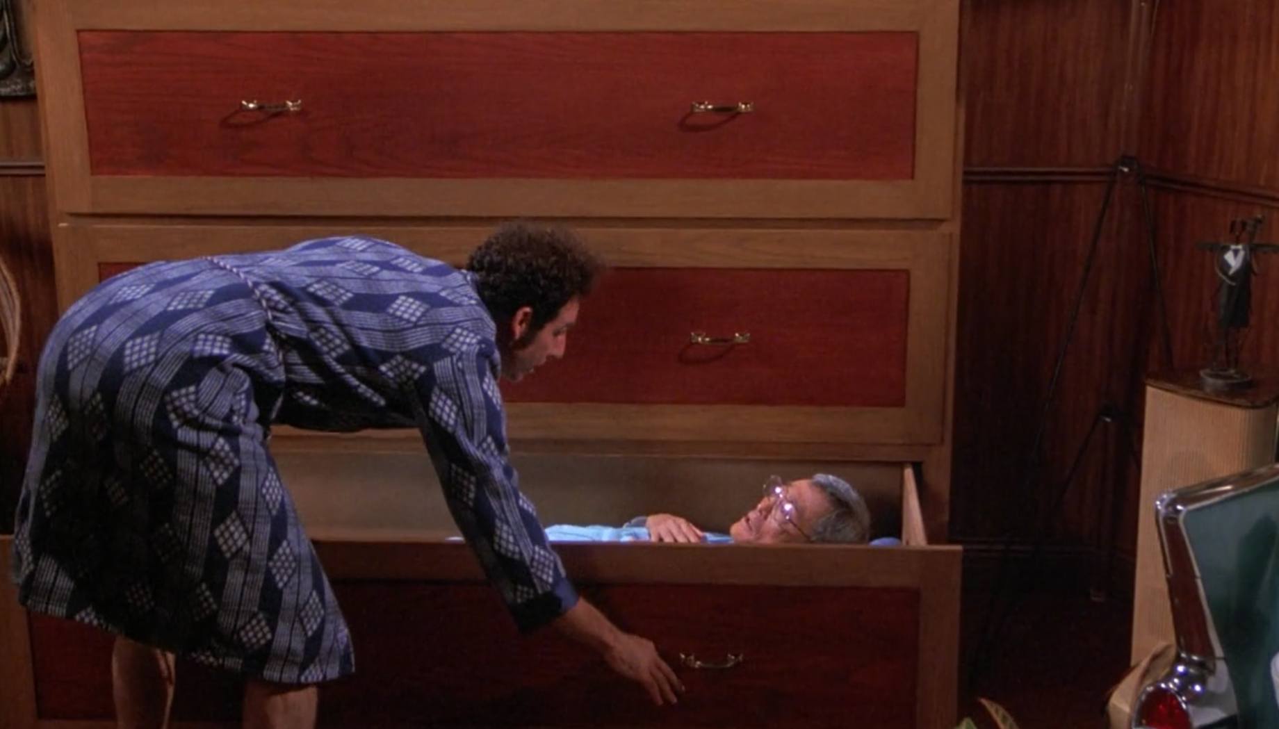 Jerry does a bit for a Japanese TV program and as a result receives hundreds of royalty checks — worth 12 cents each. Kramer makes Japanese friends on the street and decides to host them in his new dresser drawers. (Need we say more?)
