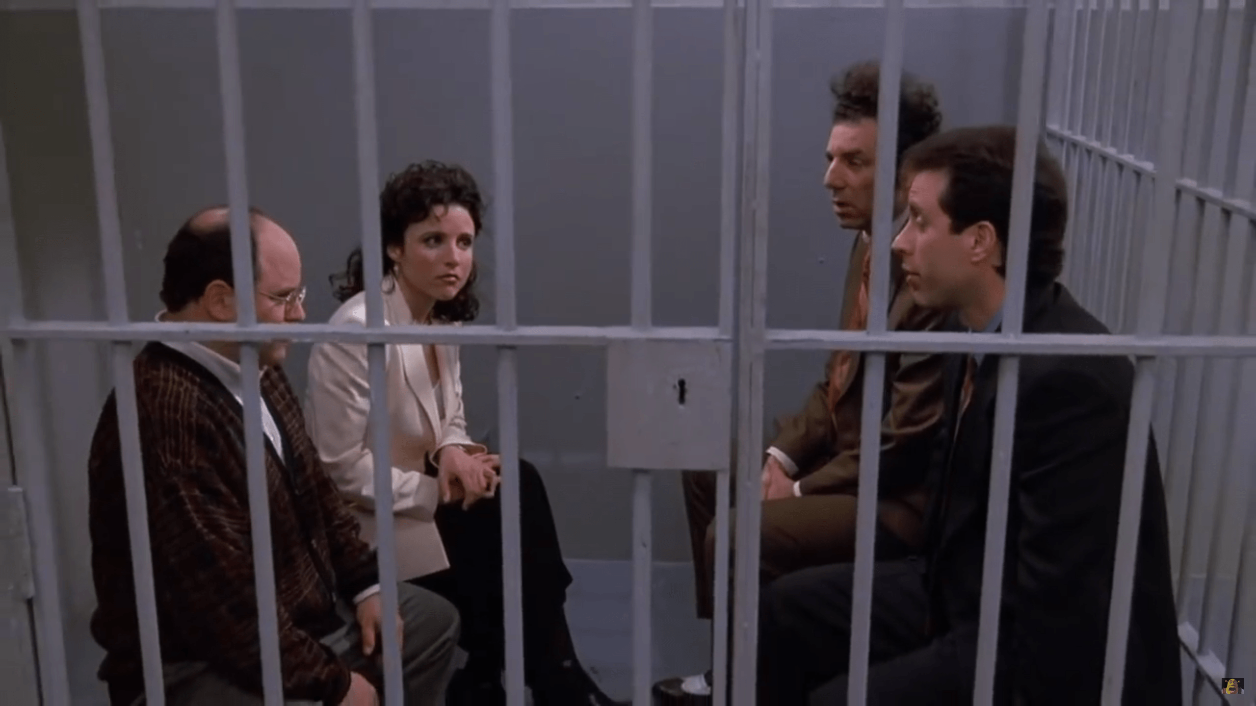 However, when their plane to Paris malfunctions, Jerry, George, Kramer (Michael Richards), and Elaine (Julia Louis-Dreyfus) are arrested for violating the “Good Samaritan Law” after they watch a man get carjacked in the fictitious town of Latham, Massachusetts, and do nothing to help.
