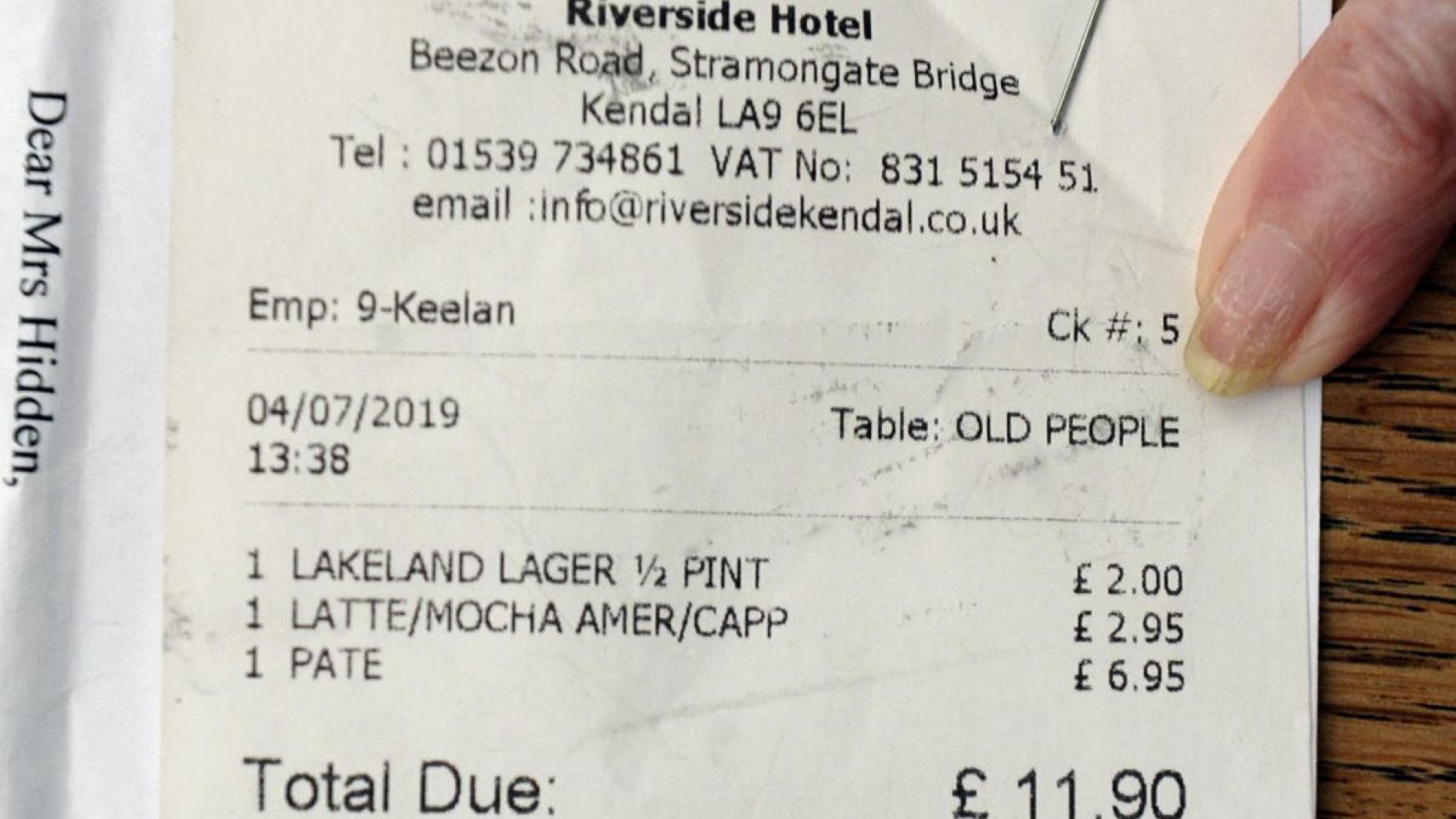 Phyllis and Robert Hidden had gone to The Riverside Hotel in Kendal, Cumbria to enjoy a lunchtime drink and meal on July 4. It wasn’t until one month later that they looked at the receipt again and noticed the words “Table: OLD PEOPLE” on their receipt. It is thought that the words were typed there by the waiter to identify who the bill belonged to.