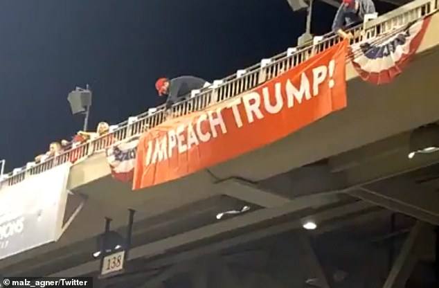 But the taunts continued throughout the game, with two fans behind the home plate unfurling signs that read ‘VETERANS FOR IMPEACHMENT’ at one stage.