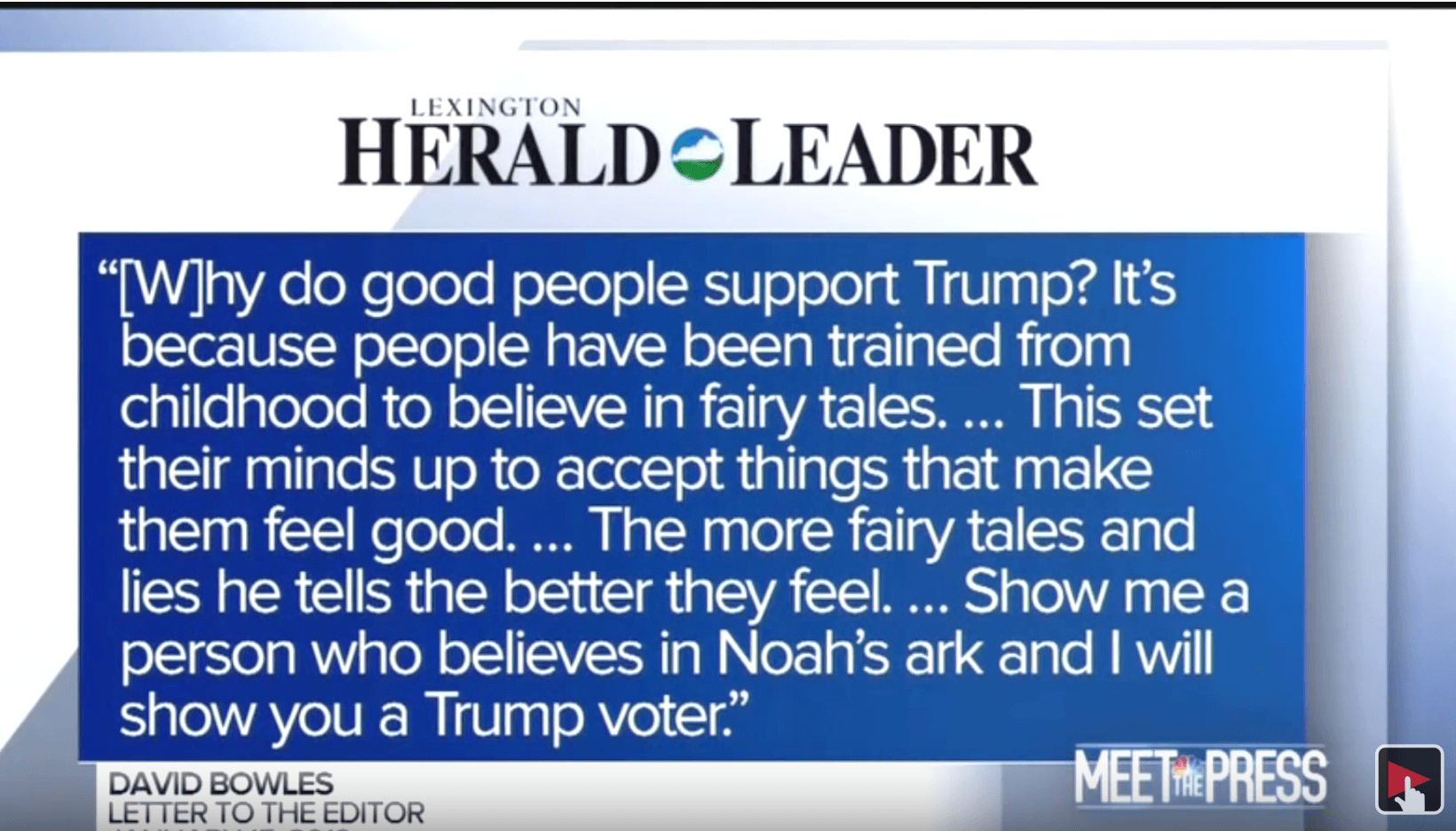 According to Todd, Noah’s Ark is a fairy tale. The letter he read on air was published in the Lexington Herald Leader and was obviously penned by a leftist. Todd used the letter in an attempt to delegitimize support for President Trump.
