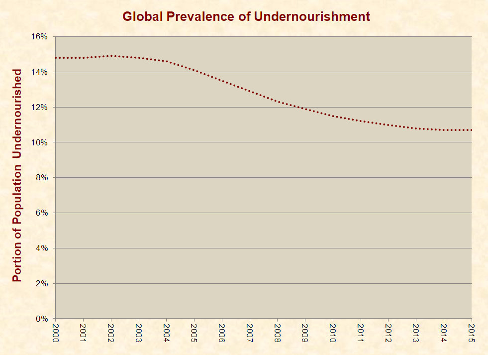 Continuing this trend, UN data from 2000 to 2015 shows that the portion of the world population that was undernourished decreased from 15% to 11%: