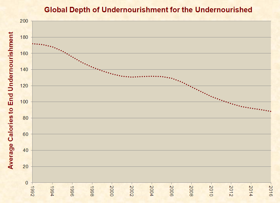 Moreover, the severity of undernourishment for the malnourished has declined. From 1992 to 2016, while global population increased by 36%, the average number of calories needed to lift all the undernourished people of the world out of that condition decreased from 172 to 88 calories per person: