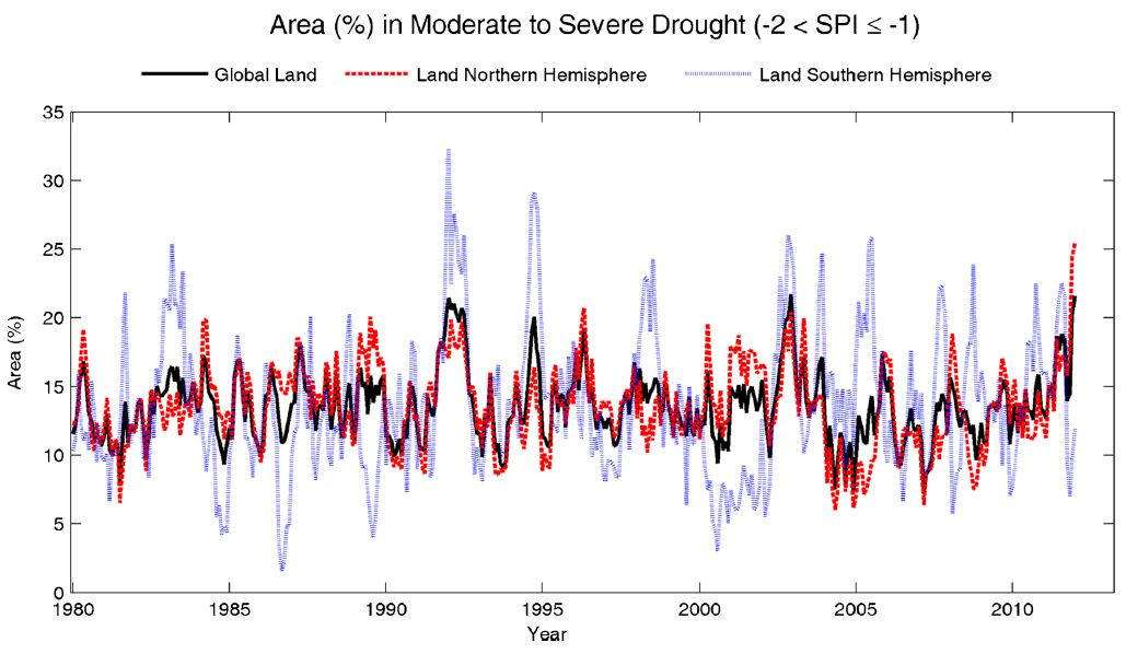 Regarding drought, a 2013 paper in the journal Theoretical and Applied Climatologyfound that contrary to “climate models,” actual observations “reveal no significant trend in the areas under drought over land in the past three decades.” The study did find increasing drought over land in the Southern Hemisphere, but the hemisphere is only 19% of the land, as opposed to 39% in the Northern Hemisphere. The trend is also well within the bounds of short-term variability, as shown in this chart from the paper: