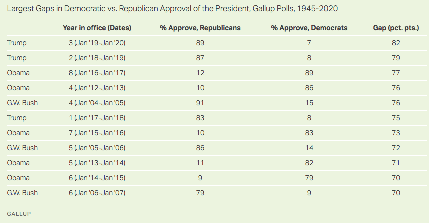 The gulf between how partisans view the Republican president has reached 82 points, easily overtaking the 77-point gap when former President Barack Obama left office.
