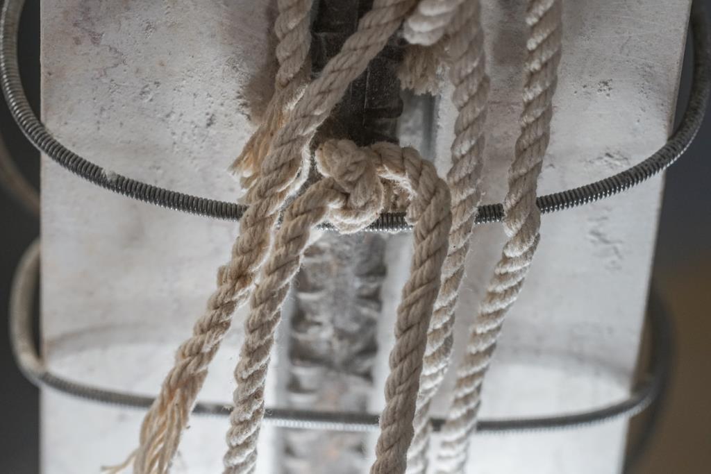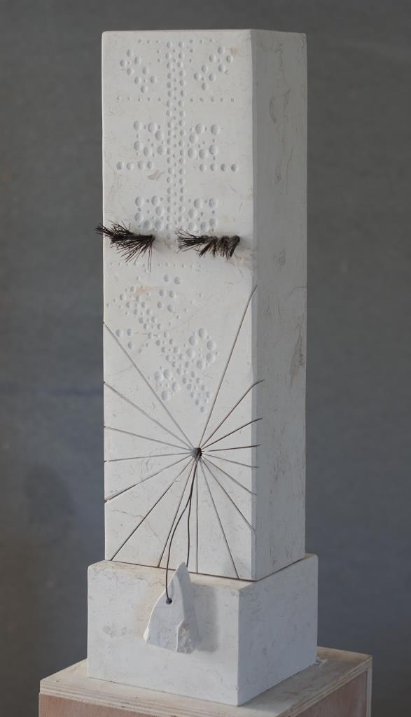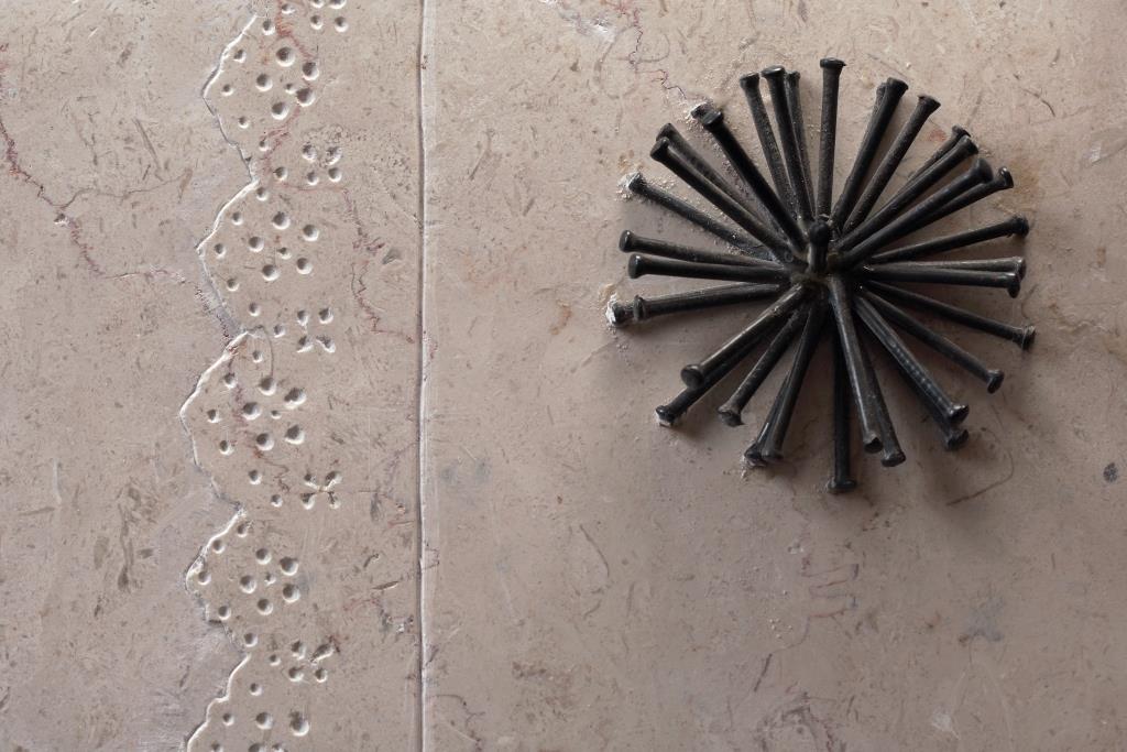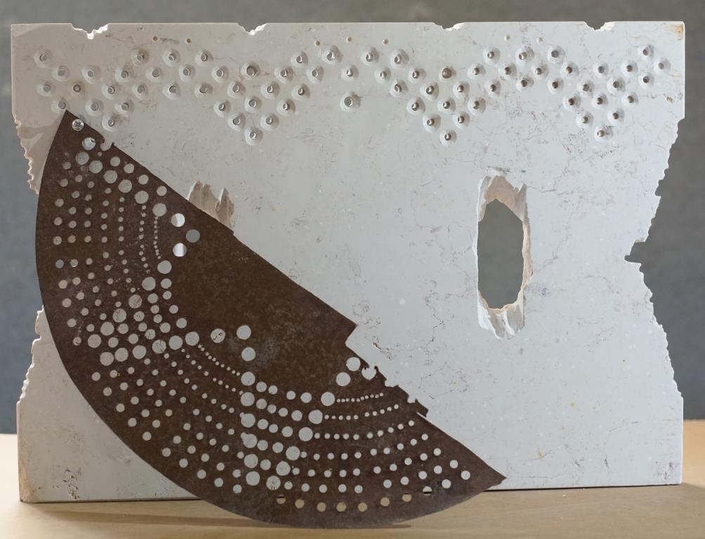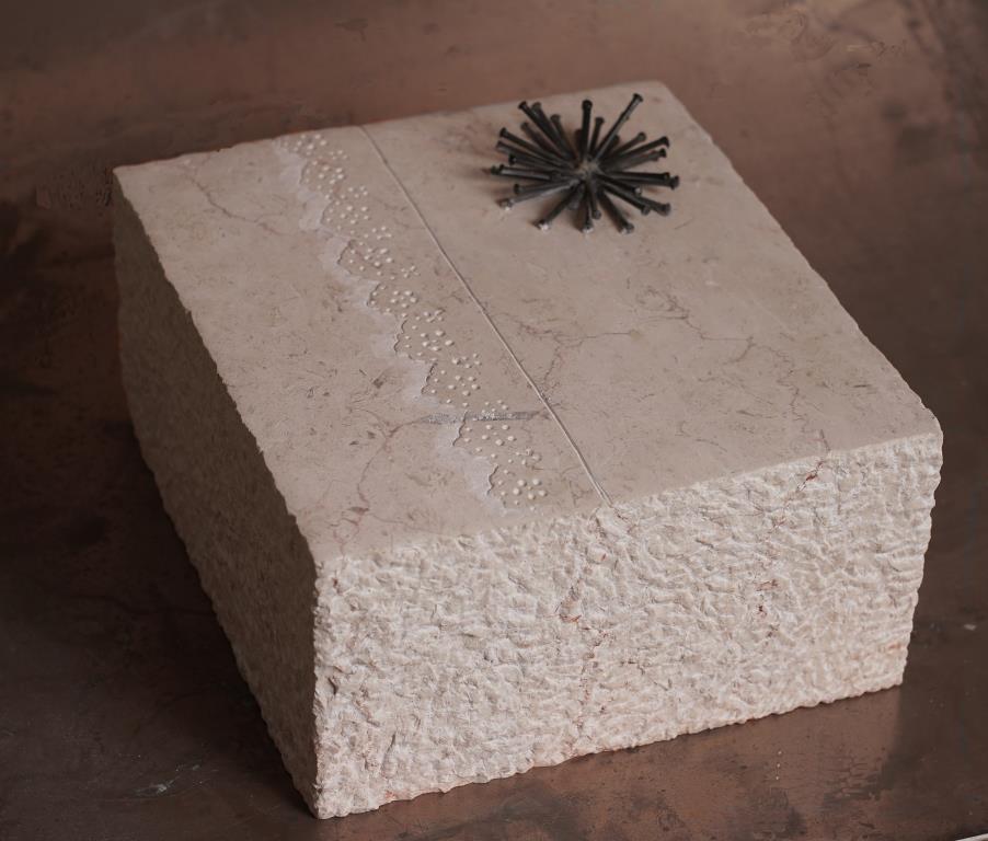 Rachel Tauber combines the timelessness of Hebron marble with the fleetingness of the contents of her mother in law’s old sewing box to create a powerful commentary on life and death