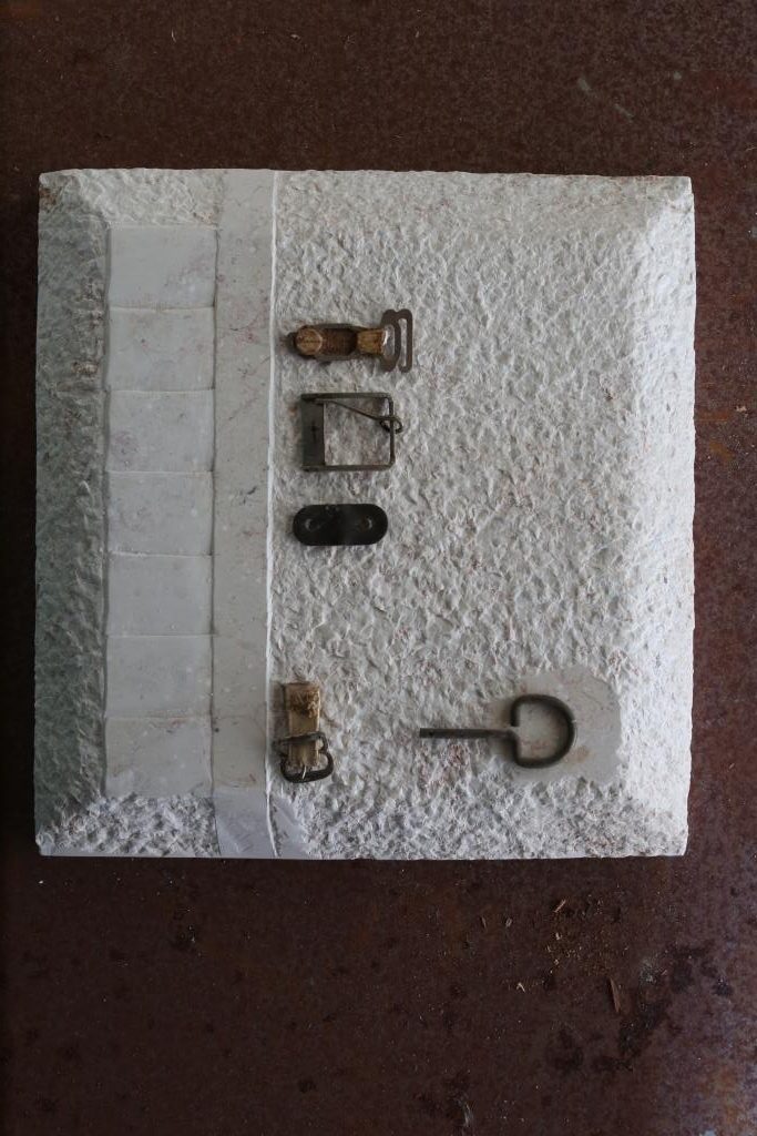 Rachel Tauber, an Israeli sculptor, sculpts in Hebron marble, a rock whose creamy texture and appearance is not very different from that of its galilee cousin. Like its cousin, it is often used in burials. Having found an odds and ends box that belonged to her mother in law, Rachel decided to do with matter what I had done in spirit. She erected a series of monuments to her deceased relative that combined a lifetime of her collected “treasures” with pieces of tombstones uniquely designed to display their own little pieces of junk. Each one of Rachel’s sculptures is in and of itself a burial monument, a headstone, a grave marker.