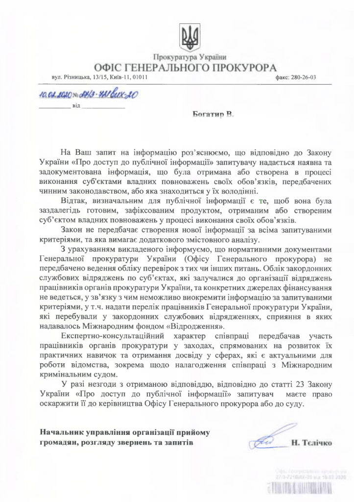 “… Regulatory documents of the Prosecutor General’s Office of Ukraine … do not provide for the accounting of inspections on certain issues. Foreign official business trips are not recorded for entities involved in the organization of business trips of employees of the prosecution authorities of Ukraine, and no specific funding sources are being kept, in connection with what is impossible to provide information on the requested criteria, including providing a list of employees of the General Prosecutor’s Office of Ukraine who were on foreign business trips, assistance in which x provided by the International Fund “Revival” – the document says.