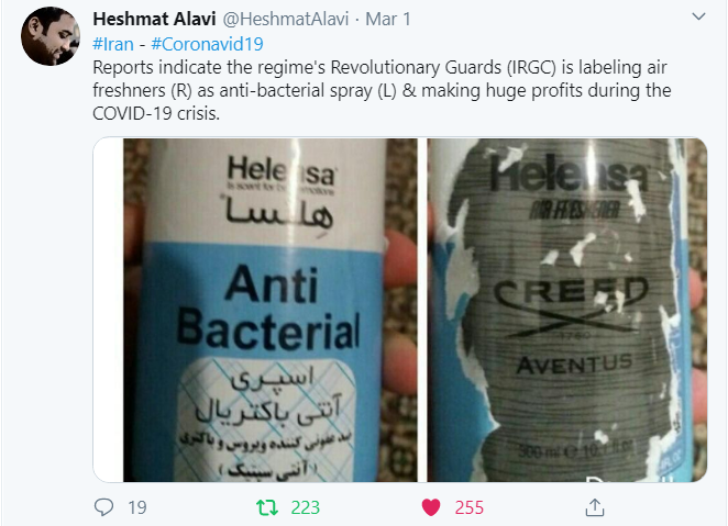 The IRGC has also in these critical days, exploited their unprecedented power to plunder; for example, changing the label of anti-odor sprays and selling them with disinfectant labels to people through markets.