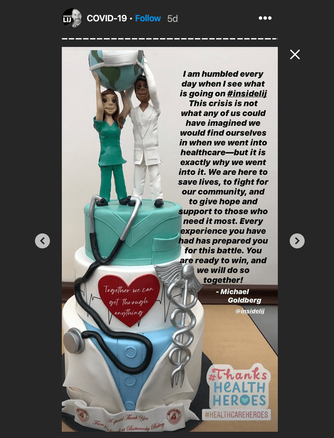 He also shared a photo of a cake featuring figurines of a doctor and nurse holding up a globe wearing a medical mask. “I am humbled every day when I see what is going on #insidelij,” Goldberg wrote.