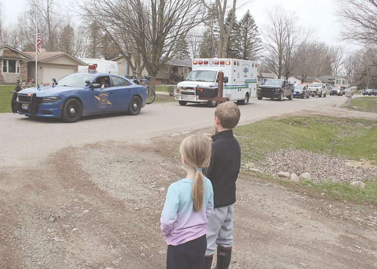 The officers and medical frontline responders and their vehicles staged in the parking lot of The County Press not far from Cain’s home. Led by Stokes in the department’s Dodge Durango, the parade included vehicles from the Lapeer Twp. Police Dept., Lapeer Police Dept., the Lapeer County Sheriff’s Dept., the Michigan State Police, the Michigan Dept. of Natural Resources and Lapeer County EMS.