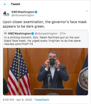A short time later, NBC followed up, “Upon closer examination, the governor’s face mask appears to be dark green.”