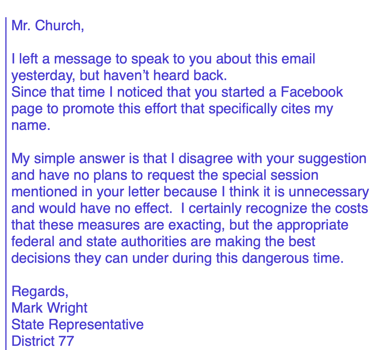 Mr. Wright responded to the email by phone to Mr. Church, but Church was unable to take his call. Mr. Wright responded from his official, public record email address, included in the April 10 update below. Wright’s email is clear, he was supportive of the decisions being made by the “appropriate federal and state authorities” and did not entertain his constituent’s request in any way.