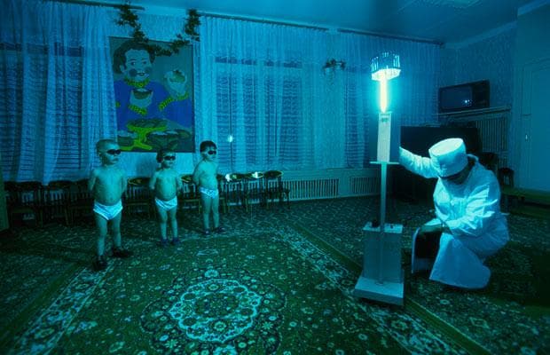 Reproduced from Holidays in Soviet Sanatoriums, just out from FUEL Publishing, this photograph captures vacationers at the Aurora sanatorium in Kyrgyzstan—one of the poorest post-Soviet states. This particular treatment involves placing ultraviolet light-emitting sterilization lamps in the ear, nose or throat to kill bacteria, viruses and fungi, writes Artbook.com