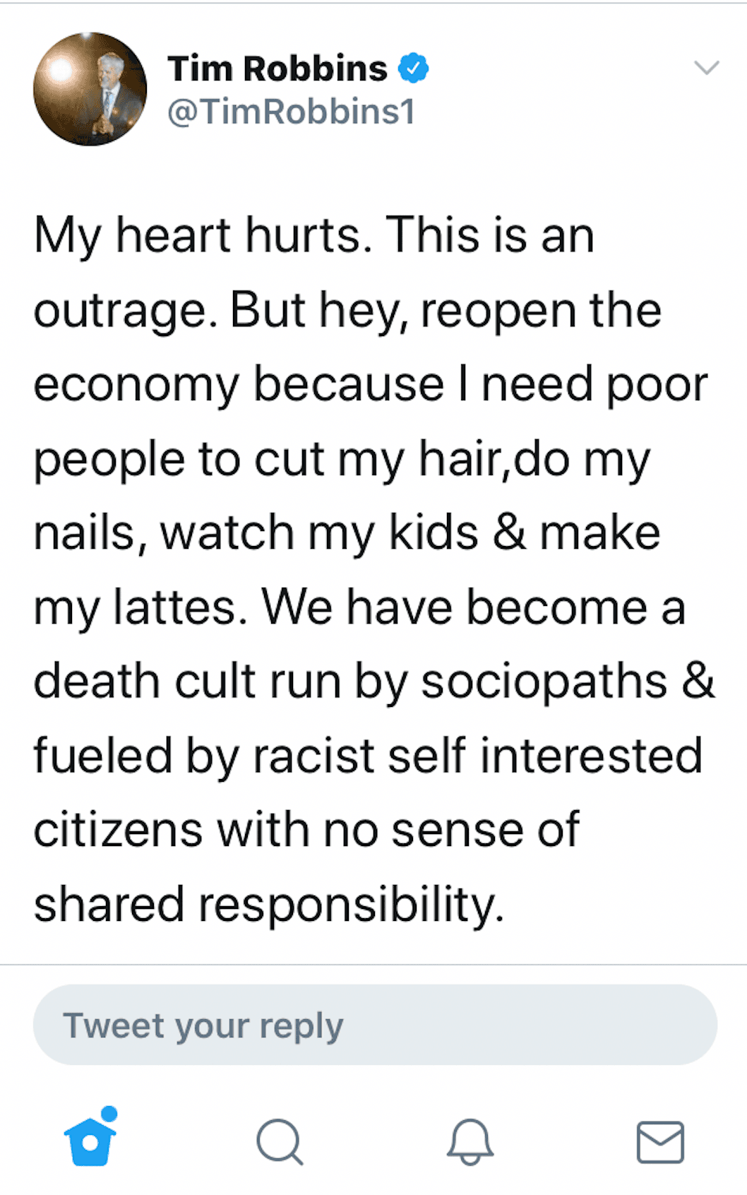 “My heart hurts. This is an outrage. But hey, reopen the economy because I need poor people to cut my hair, cut my nails, watch my kids and make my lattes,” Robbins wrote in a tweet that has since been deleted, according to Breitbart News. “We have become a death cult run by sociopaths [and] fueled by racist self-interested citizens with no sense of shared responsibility.”