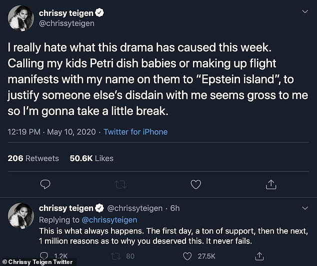 Teigen said she’s taking a break from social media and set her Twitter account to “private.”