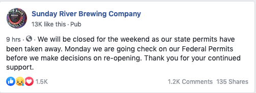 He posted on Facebook, “We will be closed for the weekend as our state permits have been taken away. Monday we are going [to] check on our Federal Permits before we make decisions on re-opening. Thank you for your continued support.”