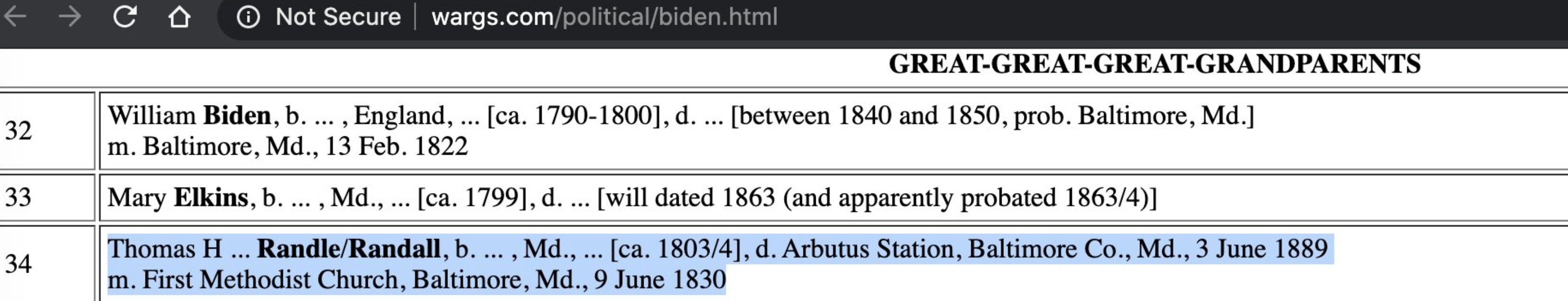 Mr. Randel is listed on the site as Joe Biden’s Great Great Great Grandfather.