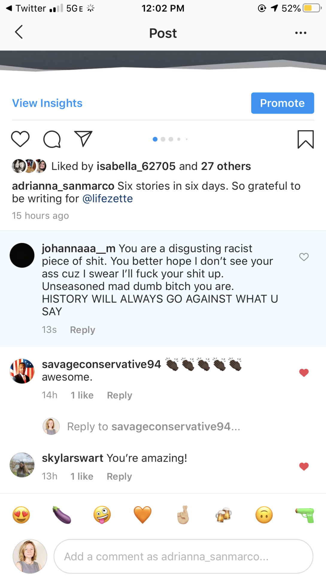 “I wanted to expand my horizons beyond on-campus reporting, and have more leeway to write on conservative issues, so I jumped at the opportunity to write for LifeZette. One of my most recent stories ‘Why Institutional Racism is a Myth‘ has received widespread backlash from my peers and professors at Syracuse University. From calls to expel me to threats of physical violence it has been a lot to process for me and my family.” (Warning: obscene and threatening language in the following social media posts.)