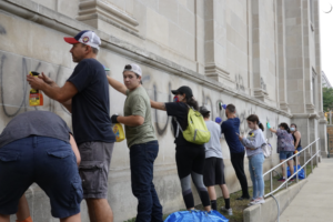 He arrived in Kenosha and was seen cleaning up graffiti with volunteers from a high school nearby the Kenosha County Courthouse.