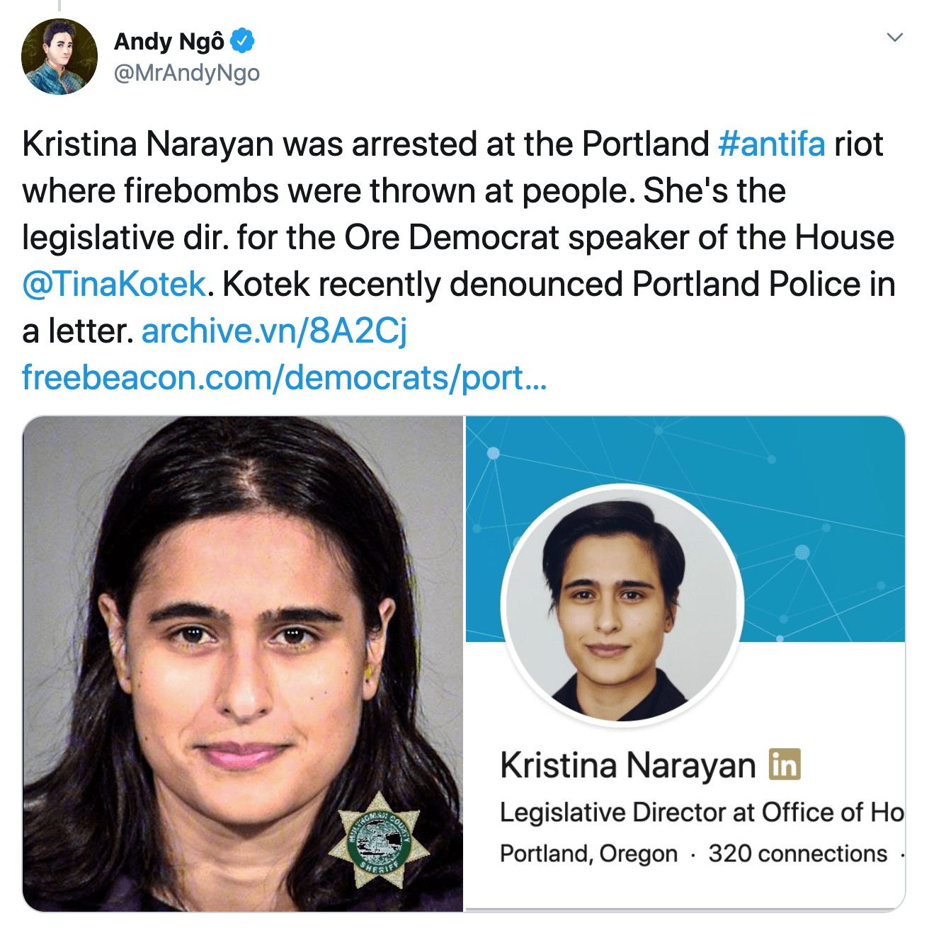 Kristina Narayan, who has worked for Democratic state Rep. Tina Kotek since September 2016, according to her LinkedIn profile, was charged with one count of “Interfering with a Peace Officer.”