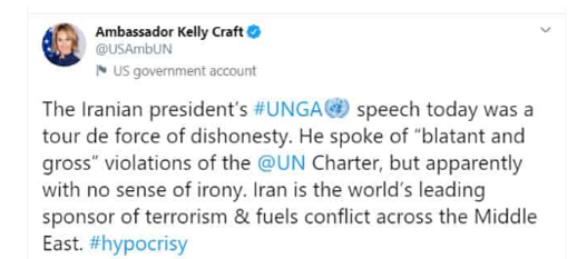 Iran’s so-called president, Hassan Rouhani, lives and rules on lies. In his speech to the United Nations General Assembly (UNGA) on September 26, 2020, he said: “If the people want to swear at someone for the country’s problems and shortages, it is the White House in Washington D.C., no one else. Don’t name anybody else for your own group’s and faction’s benefit.” The US representative to the United Nations, Kelly Craft, responded to Rouhani exactly as he deserved: “The Iranian president’s speech today was a tour de force of dishonesty”.