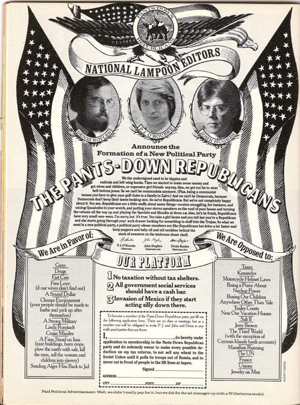 I can remember sitting in high school algebra class, not understanding a whit of it, and reading, using my textbook as a cover, the National Lampoon’s “Unwanted Foreigners” issue. It consisted of over the top hilarious slurs on every ethnicity imaginable. It was absurdist equal opportunity satire. It still ranks as one of the funniest things I’ve ever read. It was written by P.J. O’Rourke.