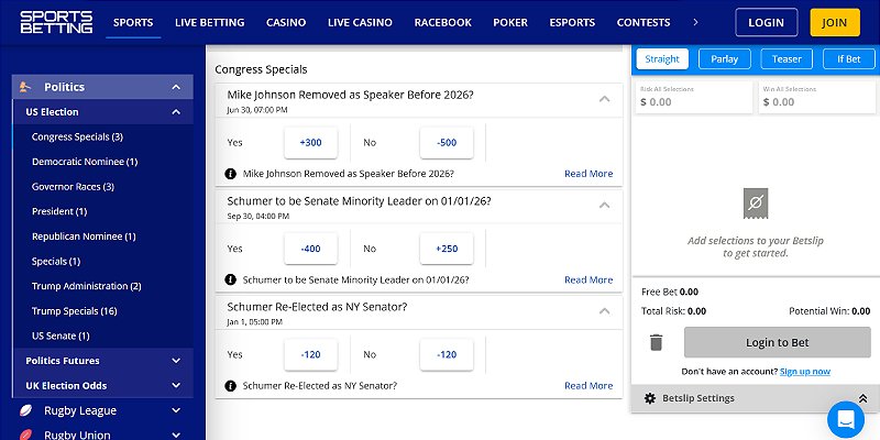 Sportsbetting.ag: Looking for one of the fairest political betting sites renowned for its generous bonuses? Bet on politics and US elections at Sportsbetting.ag and get up to $250 in bonus bets.