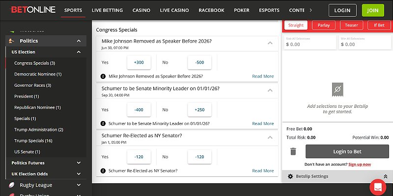 - Select a politics betting site to join (We recommend BetOnline)